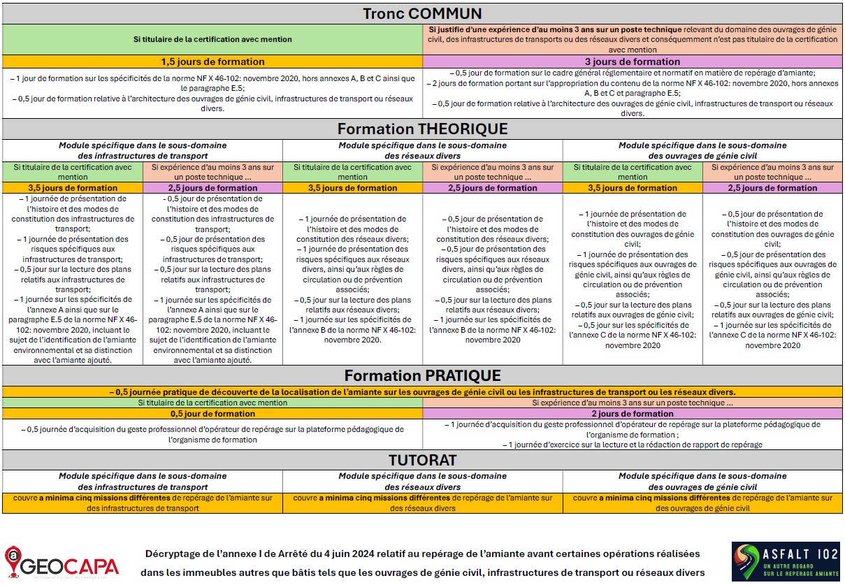pour mémoire, l’arrêté du 4 juin 2024, en application du décret 2017-899 et de la norme NFX46-102 a prévu 3 modules de compétences à acquérir et à valider afin de pouvoir réaliser la totalité des Repérages Amiante Avant Travaux (RAAT) associé à la norme (voir détail dans le tableau ci-après).